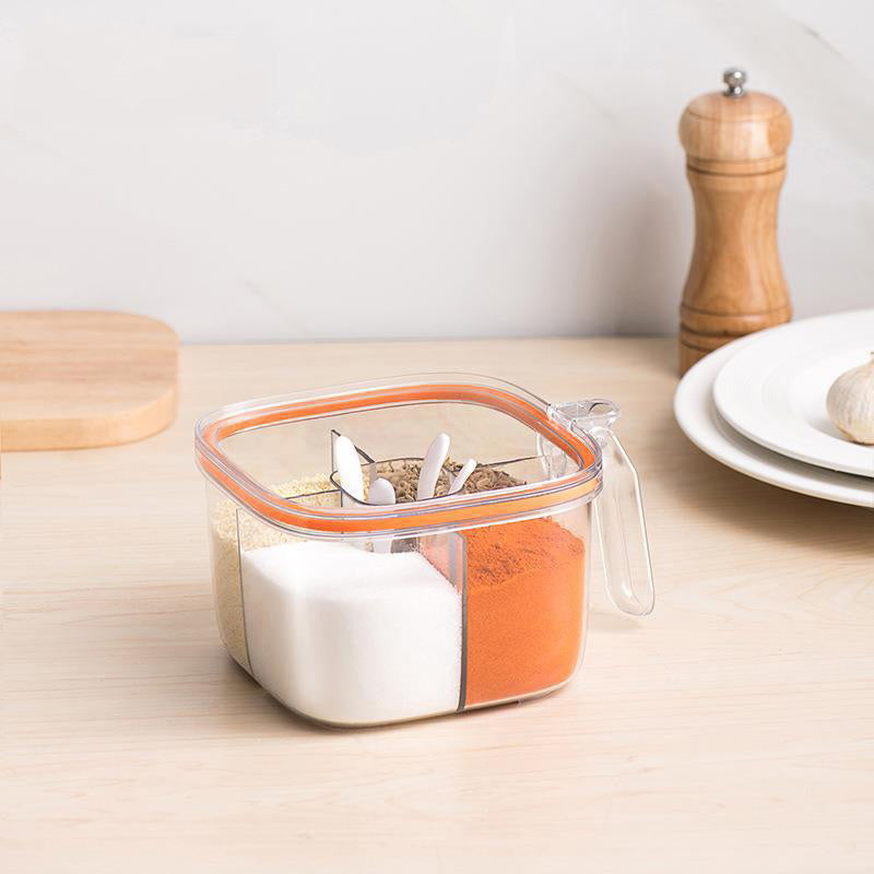 MULTIFUNCTIONEEL: De 4 compartimenten transparante afgesloten kruidenbox is verkrijgbaar in 2 kleuren, groen en oranje, zeer geschikt voor moderne en modieuze huisdecoratie, geschikt voor gezinnen, keukens, hotels, cafés, feesten, restaurants, opslag inclusief suiker, zout, bloem, koffie, kruiden etc. ook geschikt als housewarmingcadeau voor vrienden.