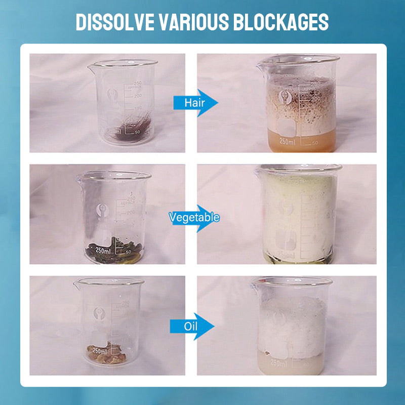 * Schadevrij: Het beschadigt het geglazuurde oppervlak, afvoeren, buizen, septische putten of andere afvoerbuizen van ijzer, koper, roestvrij staal, plastic, PVC, enz. niet. Gebruik het echter niet in aluminium producten, want het reageert met aluminium.