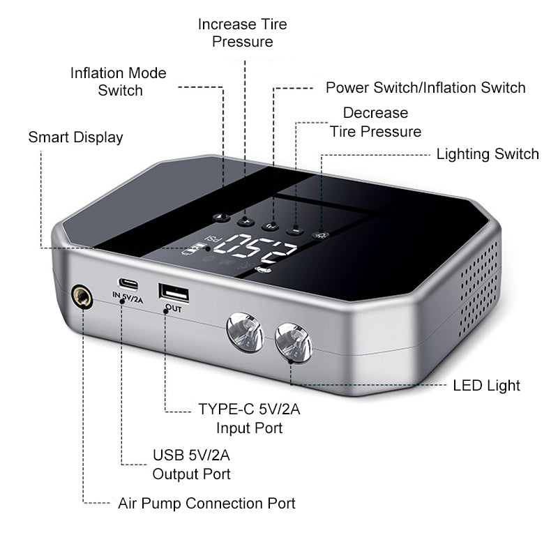 ONE-TOUCH TIRE INFLATION WITH SMART PRESSURE CONTROL: Pomp eenvoudig auto-, motor- of fietsbanden op met de ingebouwde luchtpomp. Stel de gewenste druk in en het apparaat stopt automatisch wanneer het doel is bereikt. De realtime digitale display houdt je op de hoogte van de voortgang van het oppompen en de huidige bandenspanning.