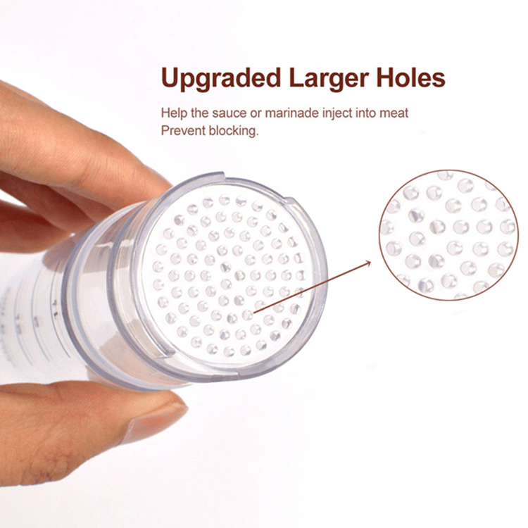 - Siliconen pakkingen van voedingskwaliteit voorkomen lekken en verspilling. De naalden zijn duurzaam en scherp en prikken gemakkelijk door elk vlees of gevogelte, zodat u de smaak van harde of dikke stukken kunt verrijken
